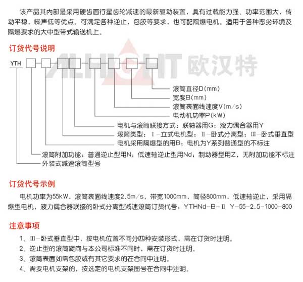 淄博歐漢特電動(dòng)滾筒有限公司生產(chǎn)的YTH型外裝式減速滾筒,是內(nèi)部采用硬齒面行星齒輪減速的最新驅(qū)動(dòng)裝置,其優(yōu)點(diǎn)是過載能力強(qiáng)、功率范圍大,傳動(dòng)平穩(wěn),噪聲低。能夠滿足各種逆止,包膠等要求,也可以配隔爆點(diǎn)擊。可以適用于各種惡劣環(huán)境及用于隔爆要求的大中型帶式輸送機(jī)上。